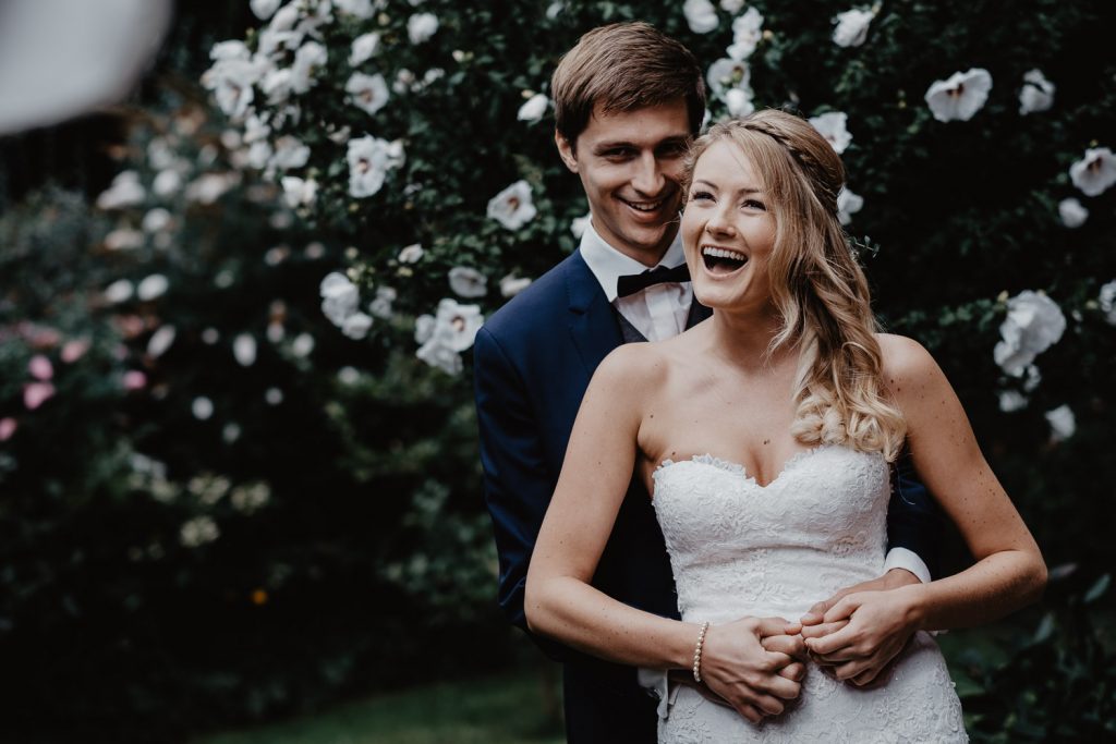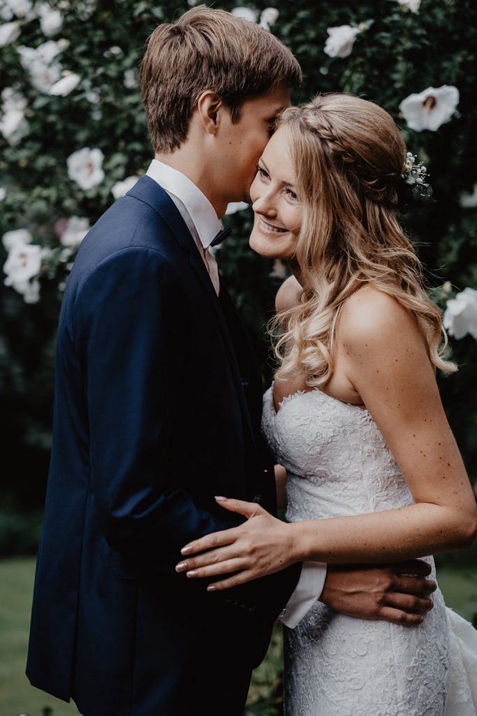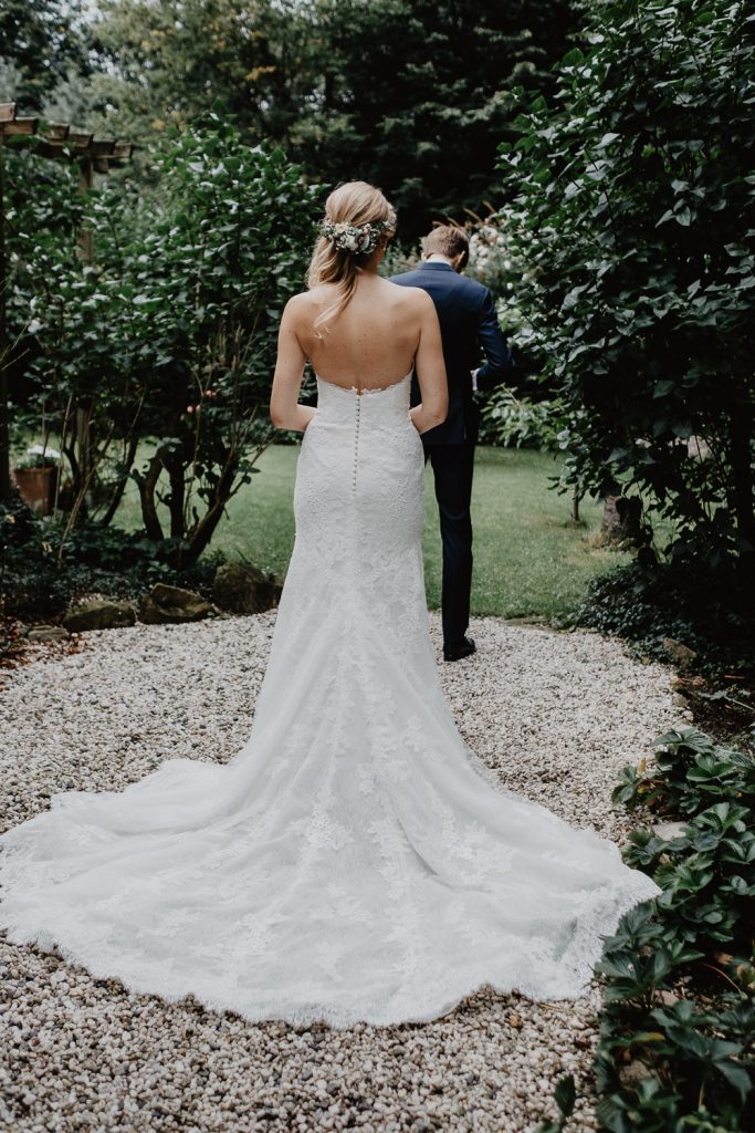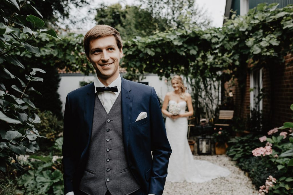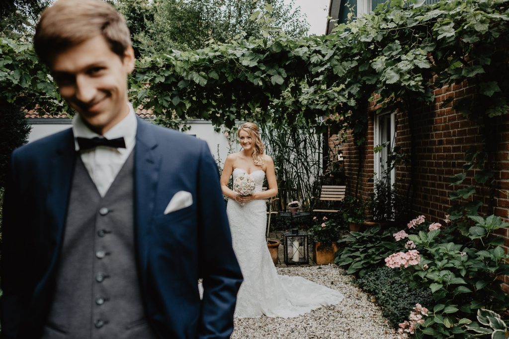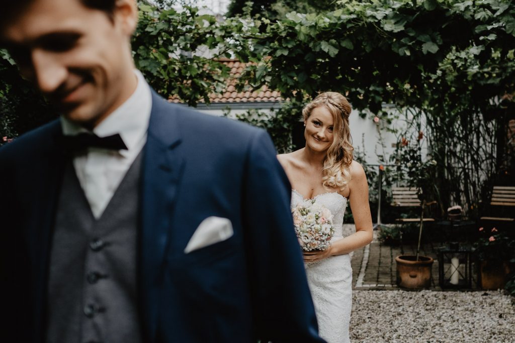 Im süßen Garten der Eltern stand am Tag der Hochzeit zunächst ein First Look Shooting auf dem Plan. Ich durfte den spannenden Moment festhalten,  als Thomas seine Steffi zum ersten Mal in ihrem Kleid gesehen hat. Und er war einfach nur begeistert, schließlich sah Steffi als Braut einfach wunderschön aus. Durch die intime Atmosphäre sind ganz besondere Paarbilder entstanden.